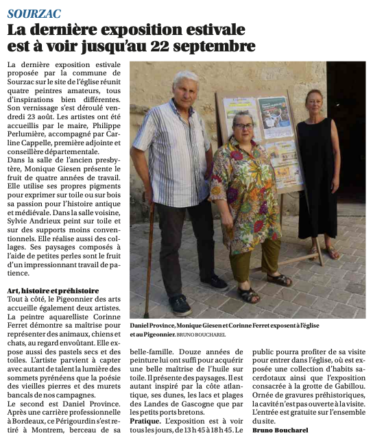 Jusqu’au 22 septembre, nous occupons, Corinne Ferrer et moi, le pigeonnier des arts à côté de l’église de Sourzac.